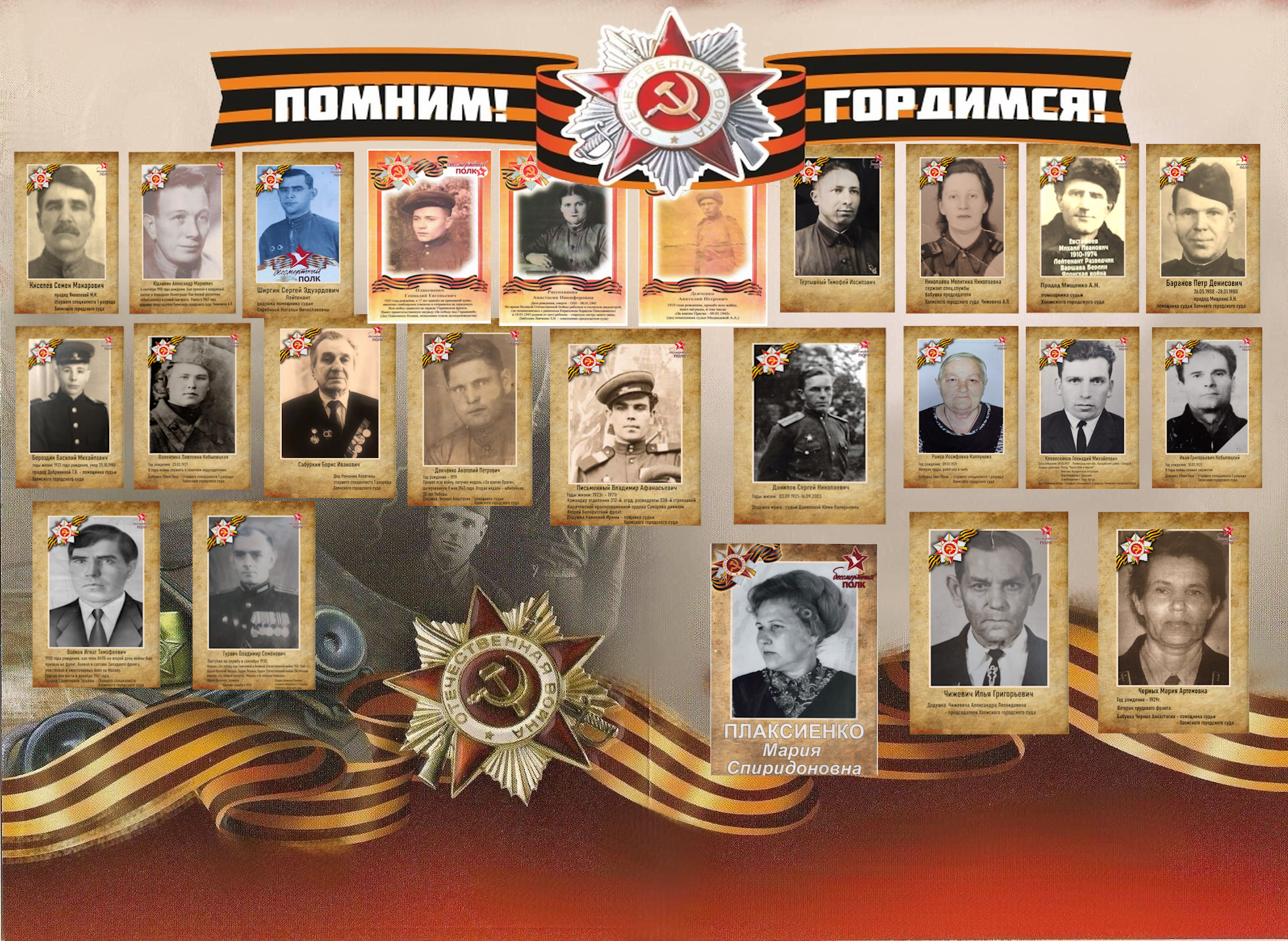 Помним! Гордимся! Трагическая дата 22 июня 1941 года навсегда останется в памяти народа. Более восьмидесяти лет назад люди нашей страны встали перед лицом войны. Вся страна: от мала до велика поднялась на борьбу с фашистскими захватчиками (оккупантами). Ничто так не сплачивает людей, как общая беда. Народы нашей многонациональной страны продемонстрировали сплоченность, показали силу духа, героизм, отвагу, преданность Родине, патриотизм в самом высоком смысле этого слова. Великая Отечественная война была самой кровопролитной и разрушительной в истории человечества. Мы должны всегда помнить, какой ценой досталось нам Великая Победа. Мы скорбим о всех тех, кто отдал свои жизни за Победу над врагом. Память о них будет жить в веках, а подрастающее поколение должно знать историю своего государства, имена героев, их подвиги... Наша задача — сохранить память о подвиге народа, который своим единством и сплочённостью, трудолюбием и самоотверженностью, невероятной любовью к Родине обеспечил нам мир, свободу и независимость. Сохраним память о десятках ветеранов Великой Отечественной войны – родственников сотрудников суда: наших дедов и прадедов, которые героически приближали Великую Победу. Киселев Семен Макарович Юдашкин Александр Маркович Ширгин Сергей Эдуардович Плаксиенко Геннадий Евгеньевич Рассоханова Анастасия Никифоровна Дъяченко Анатолий Петрович Тертышный Тимофей Иосифович Николаева Мелитина Николаевна Евстафеев Михаил Иванович Баранов Петр Денисович Бороздин Василий Михайлович Кобыляцкая Валентина Павловна Сабуркин Борис Иванович Даниченко Анатолий Петрович Письменный Владимир Афанасьевич Данилов Сергей Николаевич Каплунова Раиса Иософовна Клевесенков Геннадий Михайлович Кобыляцкий Иван Григорьевич Волков Игнат Тимофеевич Гурвич Владимир Семёнович Плаксиенко Мария Спиридоновна Чижевич Илья Григорьевич Черных Мария Артемовна Мы помним свою историю и гордимся ею! Пресс-служба суда |